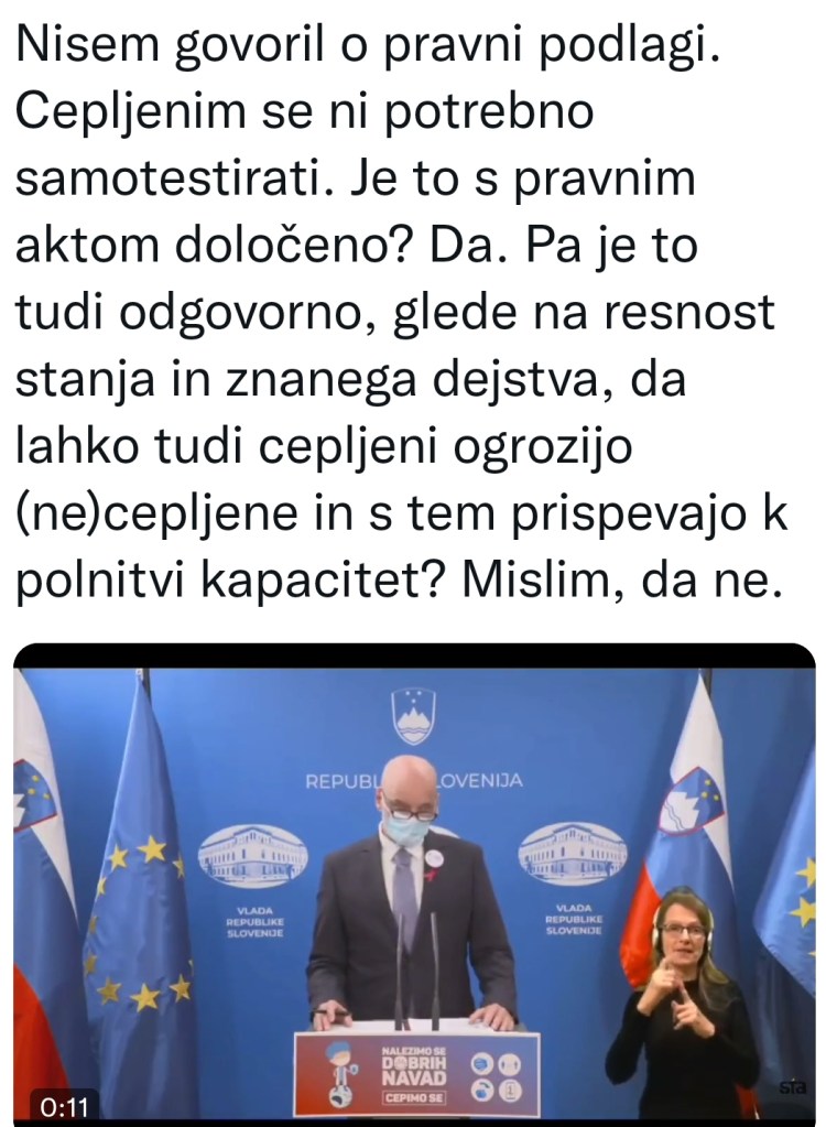 Pa poglejmo. Dne 29.10.2021 je na novinarski konferenci nastopil državni sekretar mag. Franc Vindišar, dan pred tem pa minister Poklukar. Oba sta zatrjevala, da so zadeve nadvse resne, minister Poklukar tudi, da se nam lahko zgodi “Bergamo”. Verjamem, tragično. A v tako kritičnih razmerah je že po zdravi logiki državljane potrebno pozvati k nemudnemu odgovornemu obnašanju in sprejeti ukrepe, ki bodo imeli takojšnje učinke. Kljub temu pa je sporočilo pristojnih ponovno ostalo, da z odlokom, ki prične veljati dne 1.11.2021, v splošni družbi ni predvideno obvezno testiranje cepljenih, pač pa zgolj intenzivnejše, pogostejše ter obširnejše testiranje necepljenih.