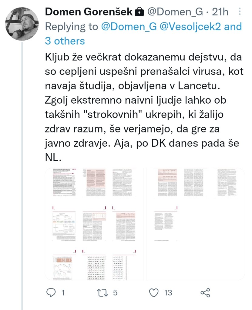 Po zapisu glede odgovornosti zaradi cepljenja mladoletnikov s cepivom Janssen in zapisu o “administrativni napaki” ministrstva, sta del stroke tokrat močno zmotila spodaj priložena zapisa. Zakaj? Tega ne vem. Sicer je res, da sta zapisana direktno, a vendarle, za vsem kar zapišem stojim. Za vsak zapis imam podlago. Podlaga opremljena z osebnim mnenjem, pa pri meni nikoli niso zapisi iz Facebooka, Twitterja ali drugih družbenih omrežij, pač pa zgolj posnetki izjav stroke same ter recenzirane študije ali članki iz strokovnih revij.
