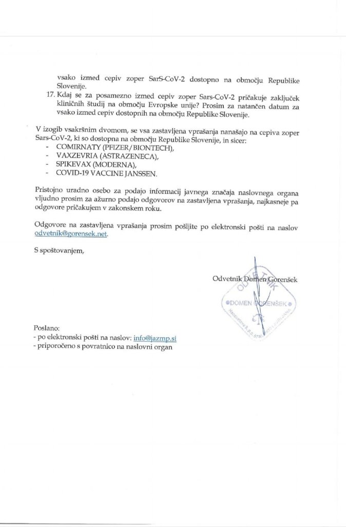 Kot je razvidno iz vsebine sporočila JAZMP, sem v zakonskem roku, dne 09.12.2021 prejel odgovore na sedem od sedemnajstih zastavljenih vprašanj, glede ostalih vprašanj, pa sem s strani pristojne agencije prejel pisno zagotovilo, da bom zaradi obsežnosti zahteve, odgovore na preostala vprašanja prejel v najkrajšem možnem času, predvidoma v naslednjem tednu, medtem ko bo o zahtevi, ki se nanaša na dostop do dokumentacije, odločeno v skladu z Zakonom o dostopu do informacij javnega značaja.