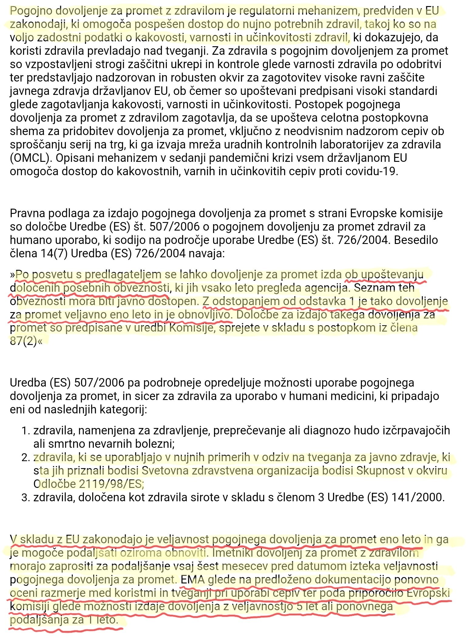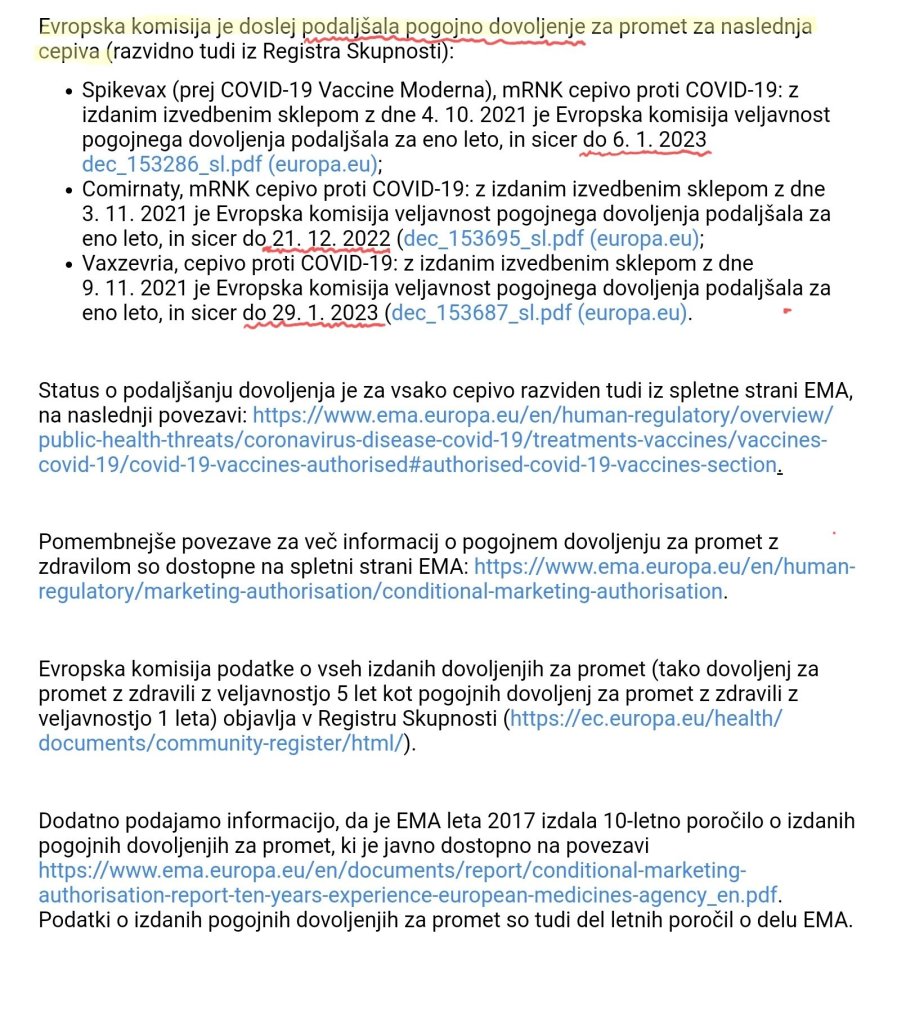 Iz odgovorov Agencije jasno izhaja, da imajo vsa cepiva zoper Sars-CoV-2, ki se trenutno nahajajo na območju Republike Slovenije zgolj pogojno in ne standardnega dovoljenja za promet, da imajo imetniki dovoljenj poleg rednih tudi dodatne obveznosti poročanja o učinkovitosti in varnosti teh cepiv, da se podatki o stranskih učinkih, varnosti in učinkovitosti teh cepiv še zbirajo in da so imetniki dovoljenj dolžni Evropski agenciji za zdravila (EMA) vsak mesec podati zbirno varnostno poročilo, ki ga oceni odbor PRAC. Poleg navedenega lahko razberemo tudi pomen simbola narobe obrnjenega črnega trikotnika. Ta cepiva imajo namreč status zdravil, za katera se zahteva dodatno spremljanje varnosti, z namenom, da so hitreje na voljo nove informacije o varnosti po pričetku cepljenja. Iz odgovorov Agencije nadalje izvemo, da se vsakokratni zaključki ocene mesečnih poročil odražajo v spremembah odobrenih informacij o zdravilu/cepivu (v povzetku glavnih značilnosti zdravila, namenjenem zdravstveni stroki in navodilu za uporabo, namenjenem pacientom oz. uporabnikom), kar seveda posledično pomeni, da se ustrezni podatki zbirajo in mesečno presojajo ter dopolnjujejo. Agencija, pa je med drugim navedla tudi datume, do katerih ima posamezno izmed cepiv zoper Sars-CoV-2 podaljšano pogojno dovoljenje.