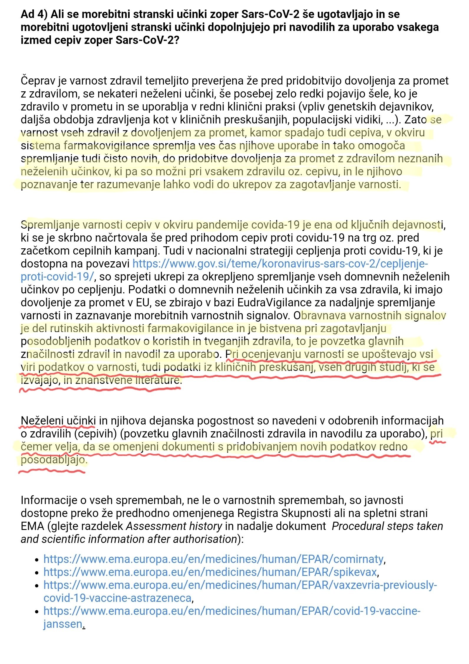Med drugimi zanimivostmi, v vsebini odgovora morda izstopa tudi zapis, da so morali predlagatelji v skladu z dokumentom »coreRMP19«, ki ga je posebej za ta cepiva izdala EMA, pri predložitvi vloge za pridobitev dovoljenja za promet z zdravilom, predložiti natančen načrt nadaljnjega spremljanja varnosti cepiv vključno s študijami, ki jih bodo izvedli, da bodo lahko nadalje ovrednotili morebitna tveganja in pridobili manjkajoče/dodatne podatke.