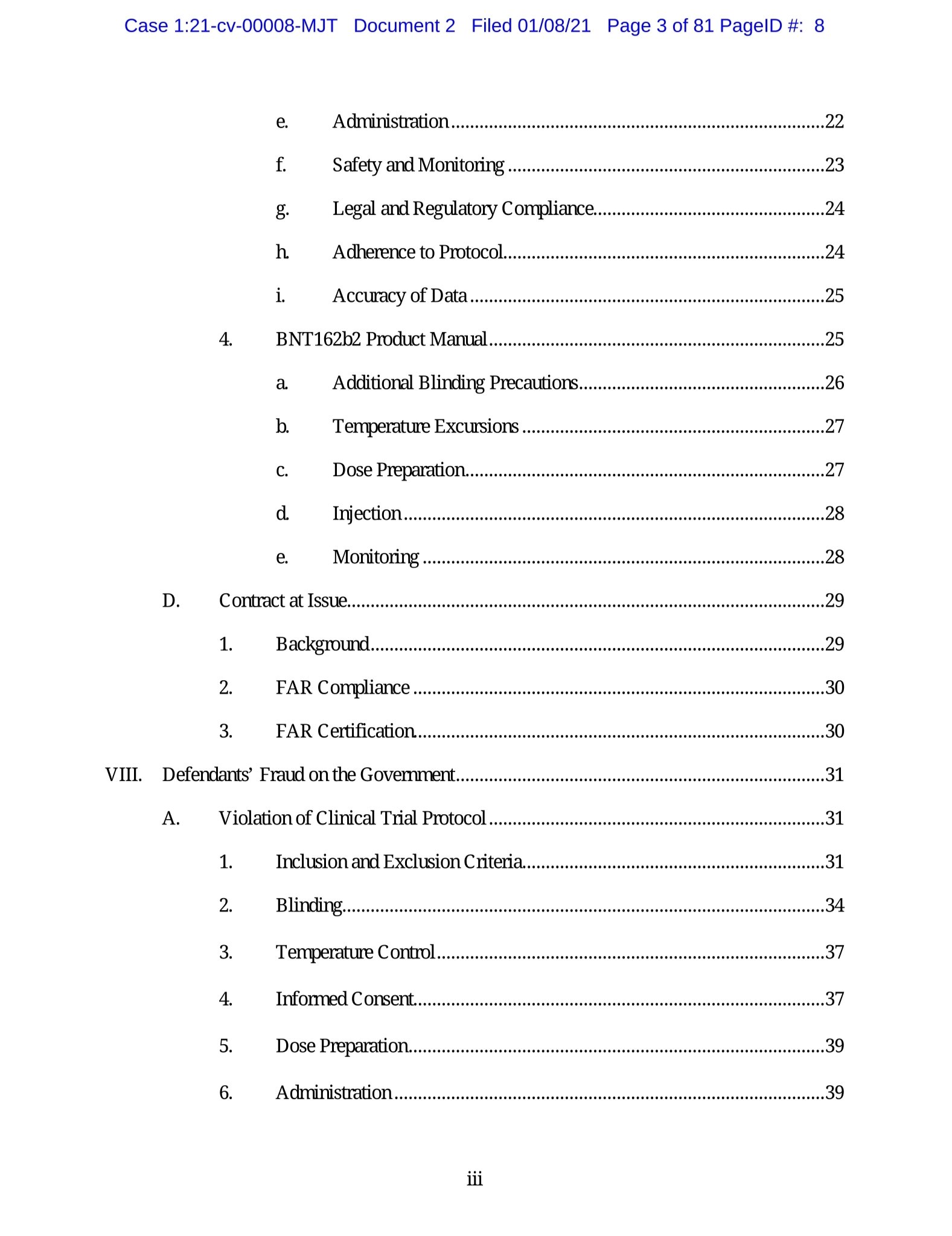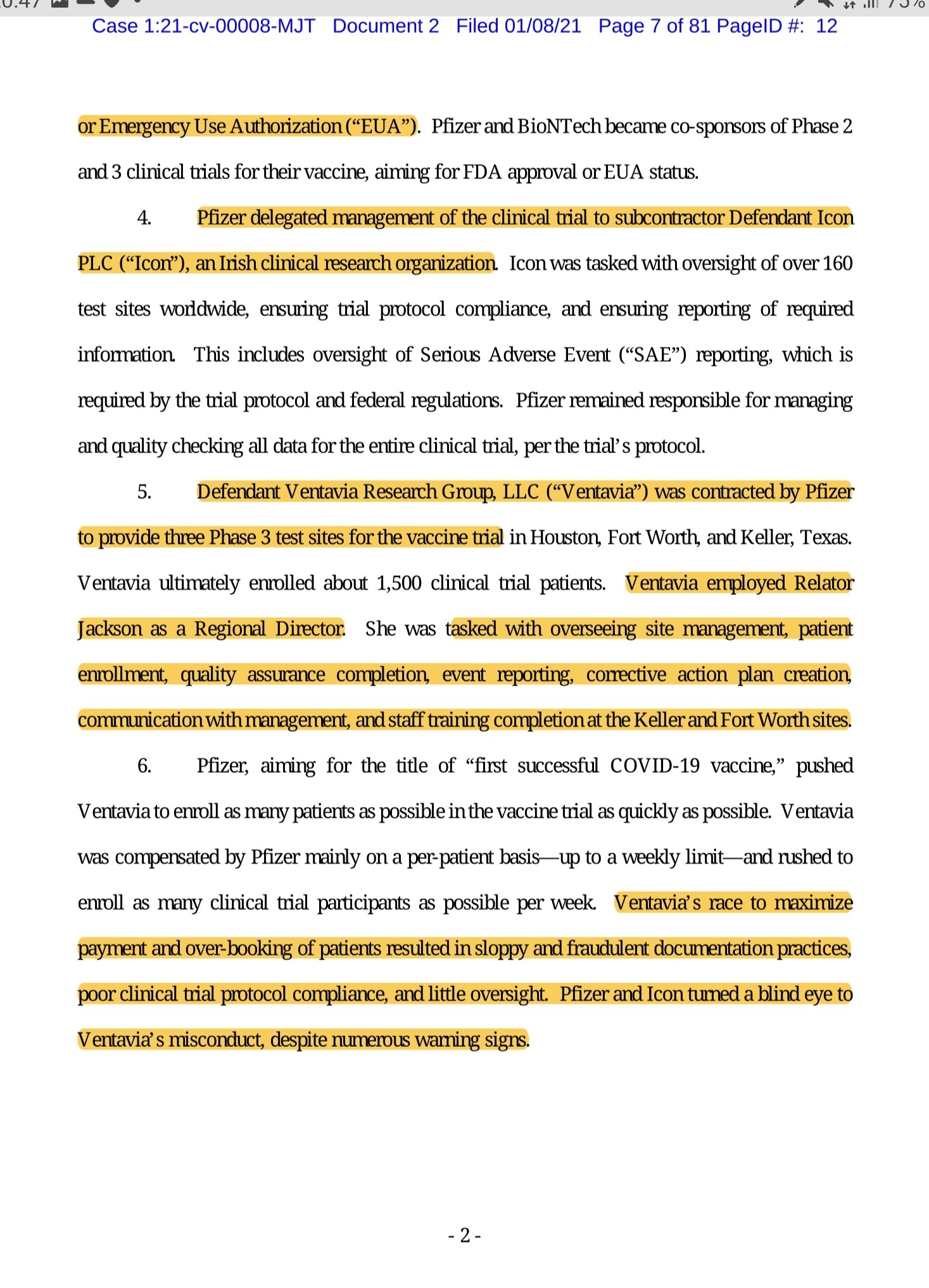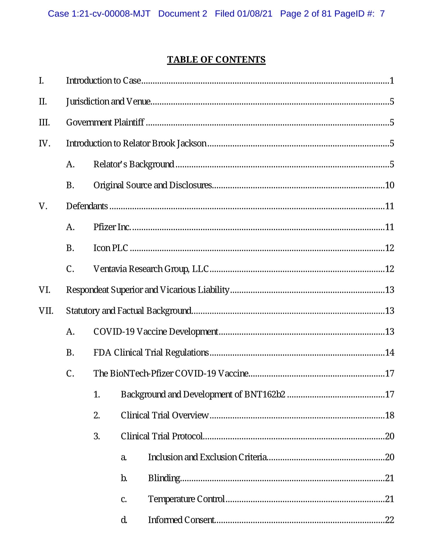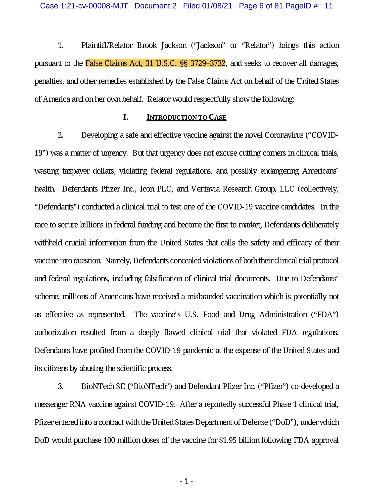 Razvoj varnega in učinkovitega cepiva proti novemu koronavirusu (“COVID- 19”) je bil nujen. Vendar ta nujnost ne opravičuje skrajševanja kliničnih preskušanj, zapravljanja davkoplačevalskih sredstev, kršenja zveznih predpisov in morebitnega ogrožanja zdravja Američanov. Tožene stranke Pfizer Inc., Icon PLC in Ventavia Research Group, LLC (skupaj “tožene stranke”) so izvedle klinično preskušanje za testiranje enega od kandidatov za cepivo COVID-19. V tekmi za pridobitev milijardnih zveznih sredstev in za to, da bi prva prišla na trg, sta toženi stranki pred Združenimi državami namerno prikrivali ključne informacije, ki postavljajo pod vprašaj varnost in učinkovitost njunega cepiva. Toženi stranki sta namreč prikrivali kršitve protokola kliničnega preskušanja in zveznih predpisov, vključno s ponarejanjem dokumentov o kliničnem preskušanju.