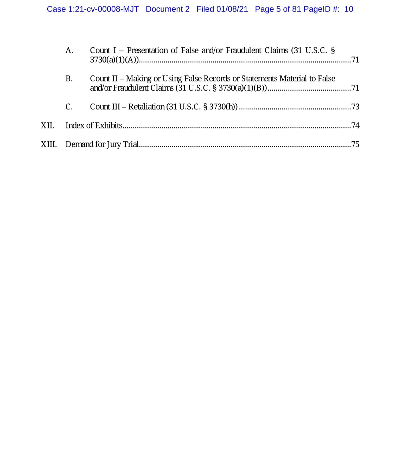 Tožnica Brook Jackson (“Jackson” ali “upravičenka”) vlaga to tožbo na podlagi “False Claims Act”, 31 U.S.C. §§ 3729-3732 in zahteva povračilo vse škode, izrek kazni in drugih pravnih sredstev, ki jih določa ta zakon in sicer v imenu Združenih držav Amerike in v svojem imenu. Tožnica želi dokazati naslednje: