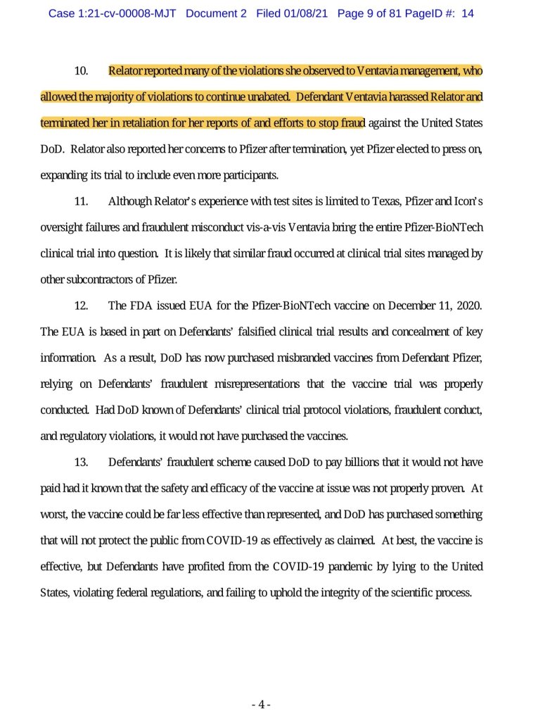 Čeprav je Relatorkina izkušnja s testnimi lokacijami omejena na Teksas, je zaradi neuspešnega nadzora in goljufivega ravnanja podjetij Pfizer in Icon v zvezi z družbo Ventavia pod vprašajem celotno klinično preskušanje podjetij Pfizer in BioNTech. Verjetno je, da je do podobnih goljufij prišlo tudi na kliničnih preskuševalnih mestih, ki jih upravljajo drugi podizvajalci družbe Pfizer.
