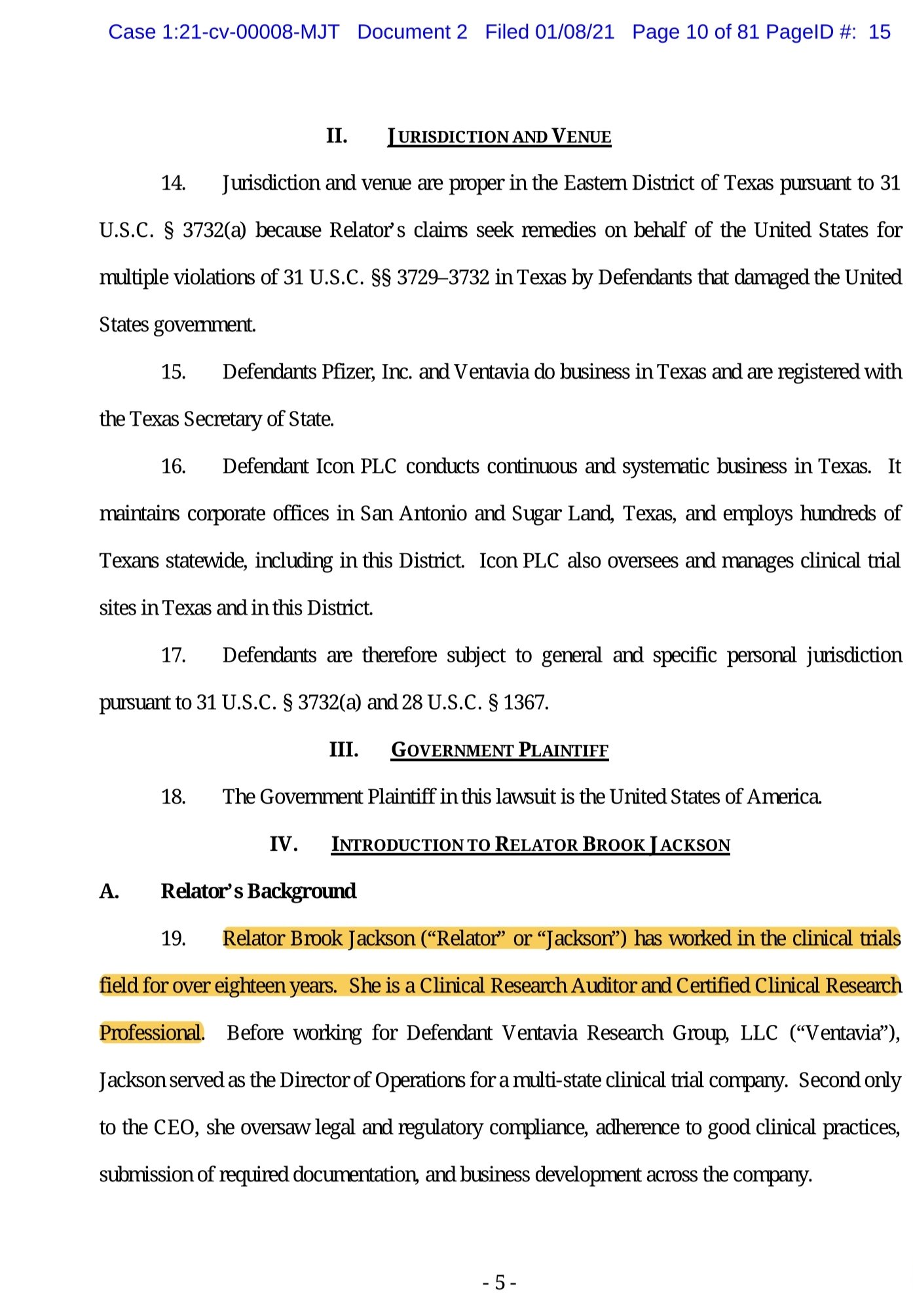 Toženi stranki Pfizer, Inc. in Ventavia poslujeta v Teksasu in sta registrirani pri pristojnem državnem sekretarju zvezne države Teksas. Tožena stranka Icon PLC stalno in sistematično posluje v Teksasu. Sedež podjetja ima v San Antoniu in Sugar Landu v Teksasu ter zaposluje več sto Teksačanov po vsej državi, tudi v tem okrožju. Družba Icon PLC tudi nadzira in upravlja mesta kliničnih preskušanj v Teksasu in v tem okrožju. Za tožene stranke zato velja splošna in posebna osebna pristojnost v skladu s členom 3732(a) 31 USC in členom 1367 28 USC.