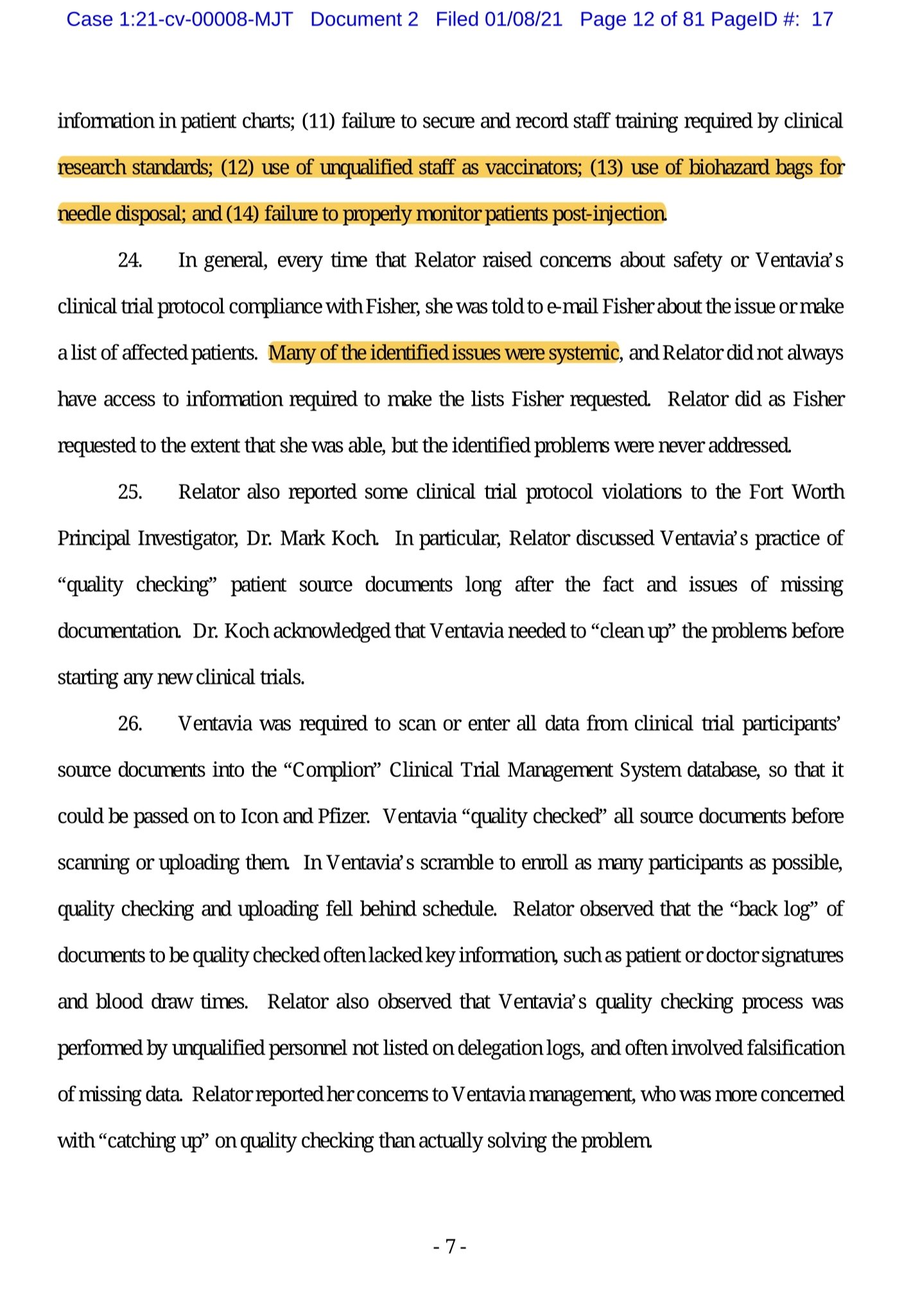 Družba Ventavia je morala skenirati ali vnesti vse podatke iz izvornih dokumentov udeležencev kliničnih preskušanj v podatkovno zbirko sistema za upravljanje kliničnih preskušanj “Complion”, da bi jih lahko posredovala družbama Icon in Pfizer. Ventavia je “preverila kakovost” vseh izvornih dokumentov, preden jih je skenirala ali naložila. Ker je želela vpisati čim več udeležencev, sta preverjanje kakovosti in nalaganje zamujala. Relatorka je opazila, da v “zadnjem seznamu” dokumentov, ki jih je bilo treba kakovostno preveriti, pogosto ni bilo ključnih informacij, kot so podpisi bolnikov ali zdravnikov in čas odvzemov krvi. Relatorka je tudi opazila, da je postopek preverjanja kakovosti v družbi Ventavia izvajalo nekvalificirano osebje, ki ni bilo navedeno v dnevnikih o prenosu pooblastil in da je pogosto ponarejalo manjkajoče podatke. Relatorka je svoje pomisleke sporočila vodstvu družbe Ventavia, ki pa se je bolj ukvarjalo z “nadomeščanjem” pri preverjanju kakovosti, kot pa z dejanskim reševanjem problema.