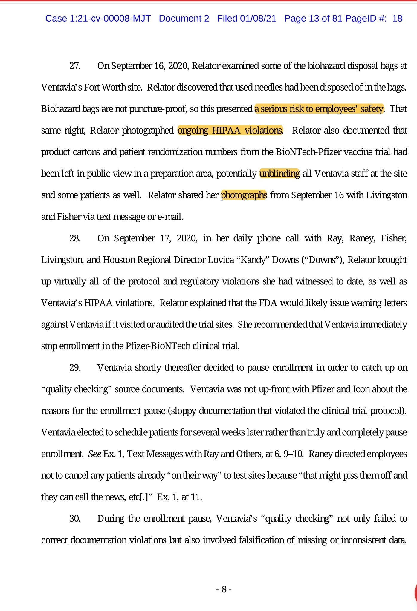 Od 8. septembra 2020 dalje je Relatorka skoraj vsak dan po telefonu, v pogovoru in po elektronski pošti poročala Fisherjevi in Livingstonovi, da sta varnost bolnikov in celovitost preskušanja cepiva Pfizer-BioNTech ogrožena. Relatorka je z Livingstonovo, Rayevo, Raneyijevo in Fisherjevo razpravljala o skoraj vseh kršitvah protokola kliničnega preskušanja in predpisov FDA, ki jim je bila priča, med drugim o: