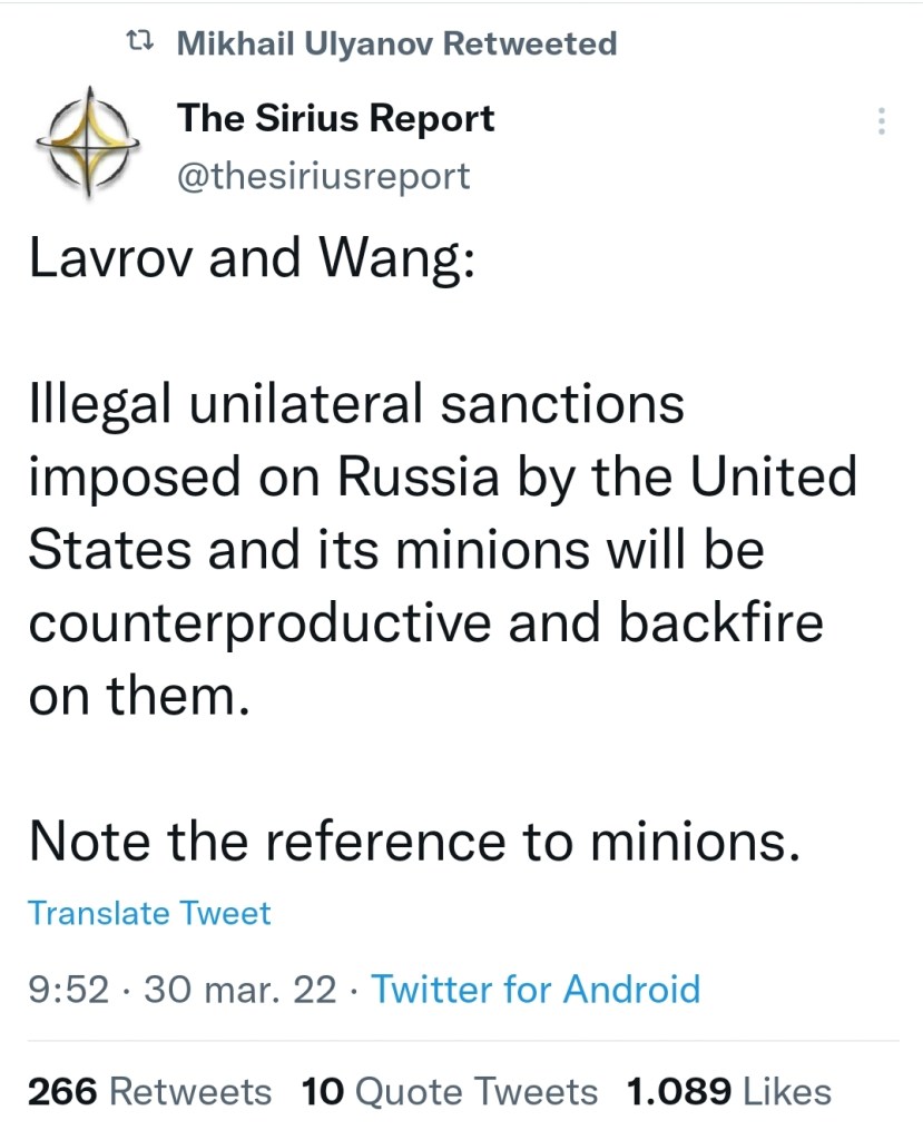 Katere strateške poteze pa je ruska diplomacija medtem še povlekla? Zunanja ministra Ruske federacije in Ljudske republike Kitajske Sergej Lavrov in Wang Yi sta konec meseca marca 2022 na skupnem srečanju ugotovila, da bodo prav ZDA in njihovi zavezniki, ki so po njunem mnenju proti Rusiji uvedli nezakonite enostranske sankcije najbolj trpele ekonomske posledice teh dejanj, da bodo sankcije imele nasprotni učinek oziroma se bodo tem državam vrnile kot bumerang. Če k temu dodamo še dejstvo, da sta skoraj istočasno še Rusija in Indija praktično že sklenili trgovinski sporazum glede prihodnjega poslovanja v rubljih in rupijah, s čemer bosta iz medsebojnega poslovanja izključili evro in ameriški dolar, lahko vsakdo, ki nima povsem zaprtih oči in prekritih ušes sam presodi kam nas vodi trenutna politika ZDA in EU ter čemu tako nenaden dvig ruskega rublja.