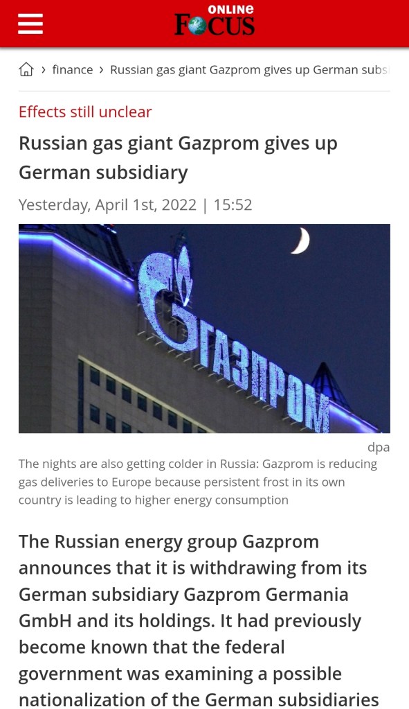 No, nemški vladi z dnem 31.3.2022 ni potrebno več razmišljati. Namesto njih se je kar ruski energetski koncern Gazprom odločil, da se sam umika iz svoje nemške hčerinske družbe Gazprom Germania GmbH in njenih deležev.