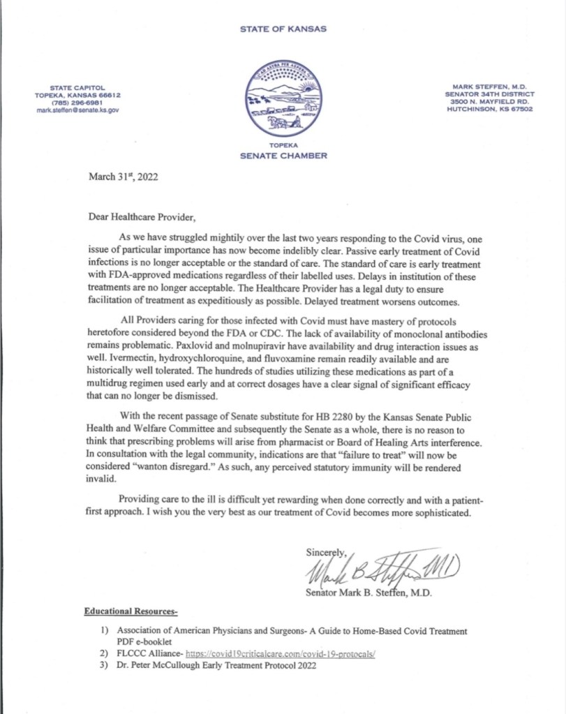 Prevod javnega pisma senatorja Marka B. Steffena, M.D. zdravstvenim delavcem v ameriški zvezni državi Kansas.