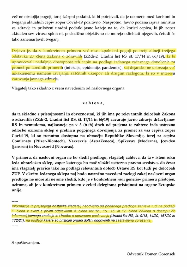 Seveda mi je bilo vnaprej jasno, da zahtevi Agencija nikakor ne bo sledila. Pristojnost državnega regulatorja za zdravila in medicinske pripomočke je namreč v primeru pripravkov zoper COVID-19, na podlagi Uredbe št. 507/2006 in Direktive št. 726/2004 v celoti uzurpirala Evropska komisija. Zato sem poleg zahteve oziroma neodvisno od te, zahteval relevantne informacije, pri čemer sem se skliceval na določbo 1. člena v zvezi s prvim odstavkom 4. člena, določbe 12., 15., 16. in 17. člena Zakona o dostopu do informacij javnega značaja ter na Uredbo o upravnem poslovanju (Uradni list RS, št. 9/18, 14/20, 167/20 in172/21), na podlagi katere so upravni organi dolžni odgovoriti na zastavljena vprašanja iz njihove pristojnosti. Na ta način sem želel pridobiti še uradno potrdilo, da ima pristojen nacionalni organ v primeru “cepiv” zoper COVID-19 zvezane roke.