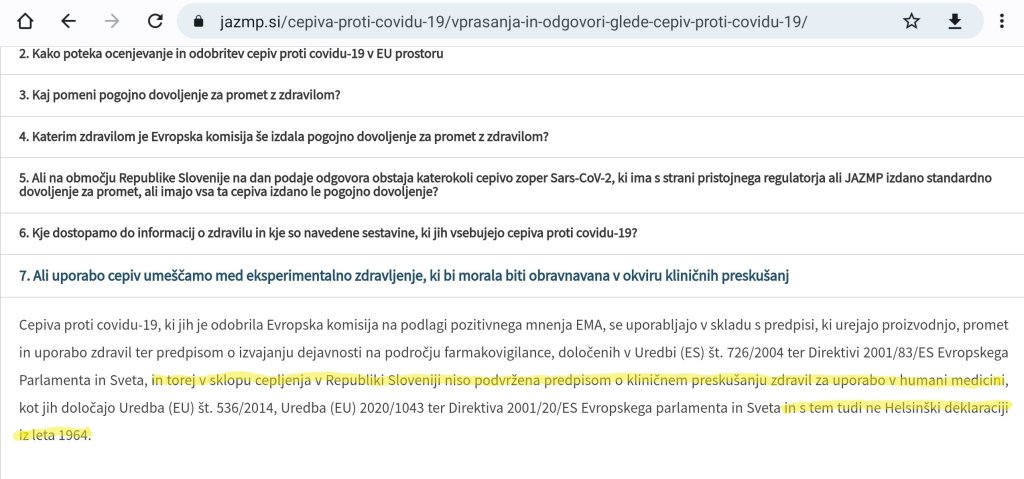 - da kljub navedenemu dejstvu iz predhodne točke, ta “cepiva”, ponovno na podlagi odobritve Evropske komisije, niso podvržena predpisom o kliničnem preskušanju zdravil za uporabo v humani medicini, kot jih določajo Uredba (EU) št. 536/2014, Uredba (EU) 2020/1043 ter Direktiva 2001/20/ES Evropskega parlamenta in Sveta in s tem tudi ne Helsinški deklaraciji iz leta 1964. ki ščiti posameznika pred nedovoljenimi biomedicinskimi poskusi;